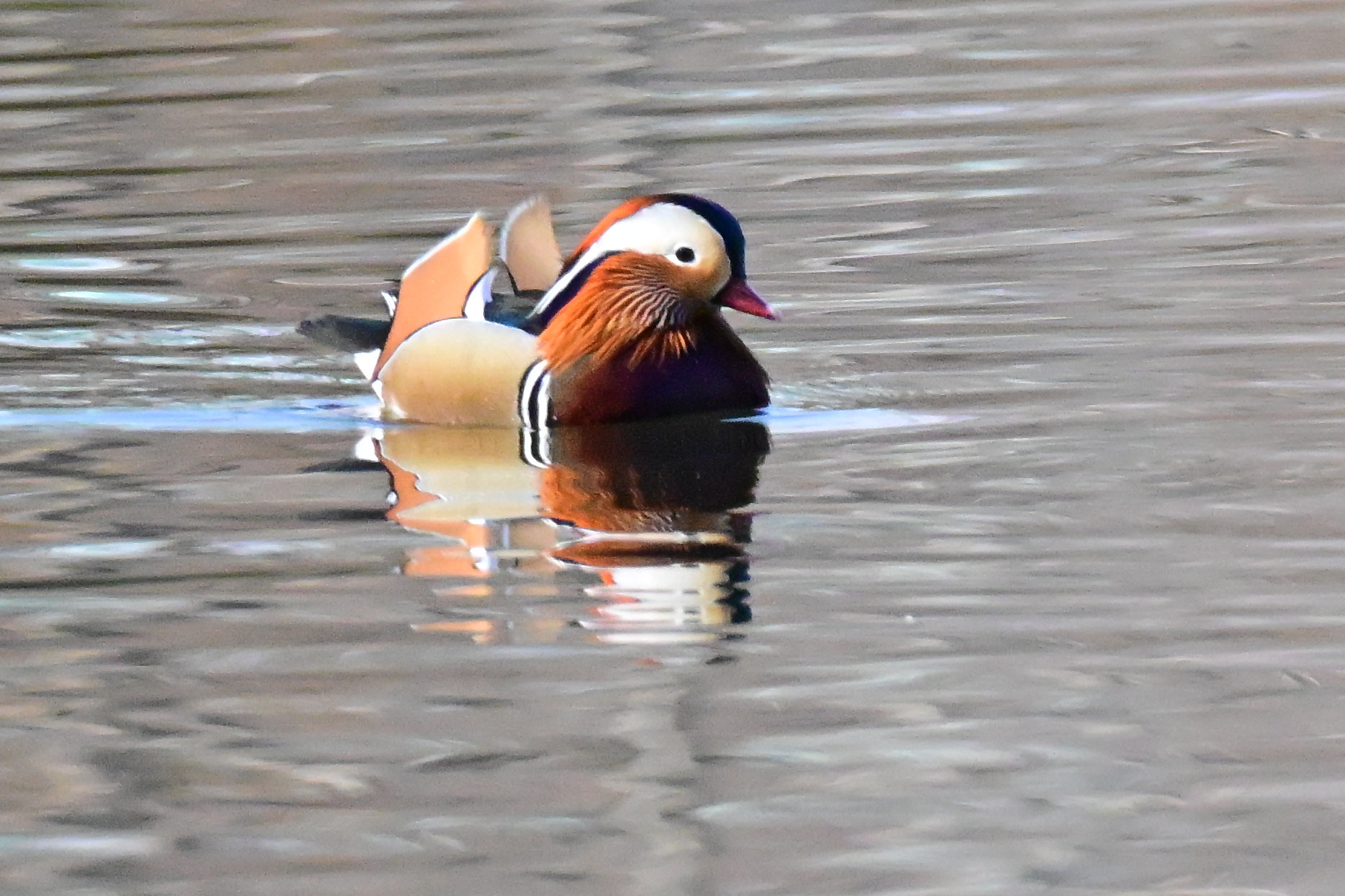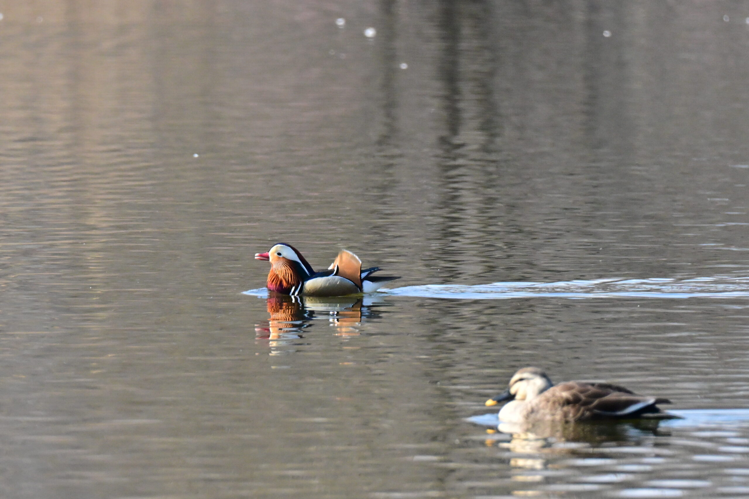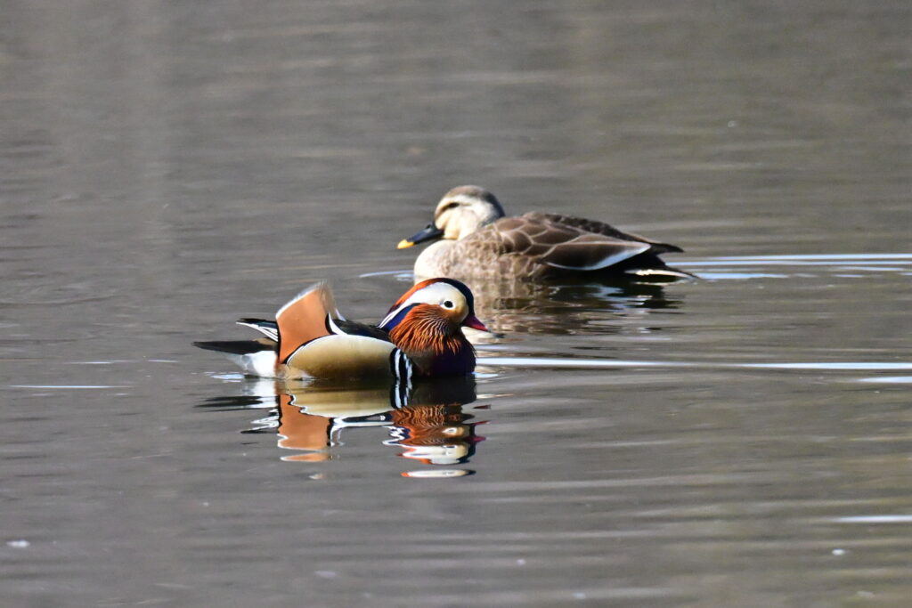 カルガモの雌につきまとわれていました。美しい姿に興味があったようでオシドリは逃げ回っていました。
