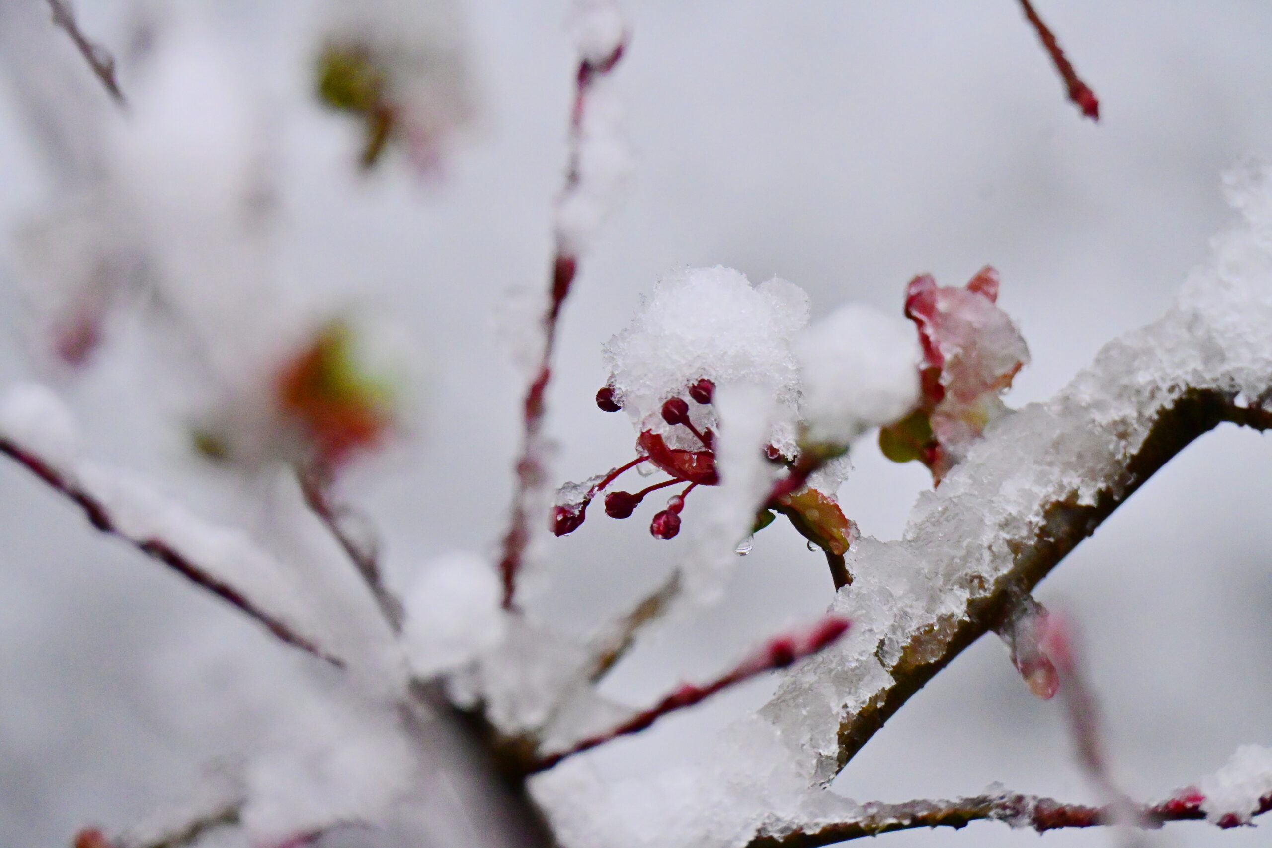 今朝は8時過ぎから雪が降ってきました。自宅の花海棠の蕾も寒そうです。