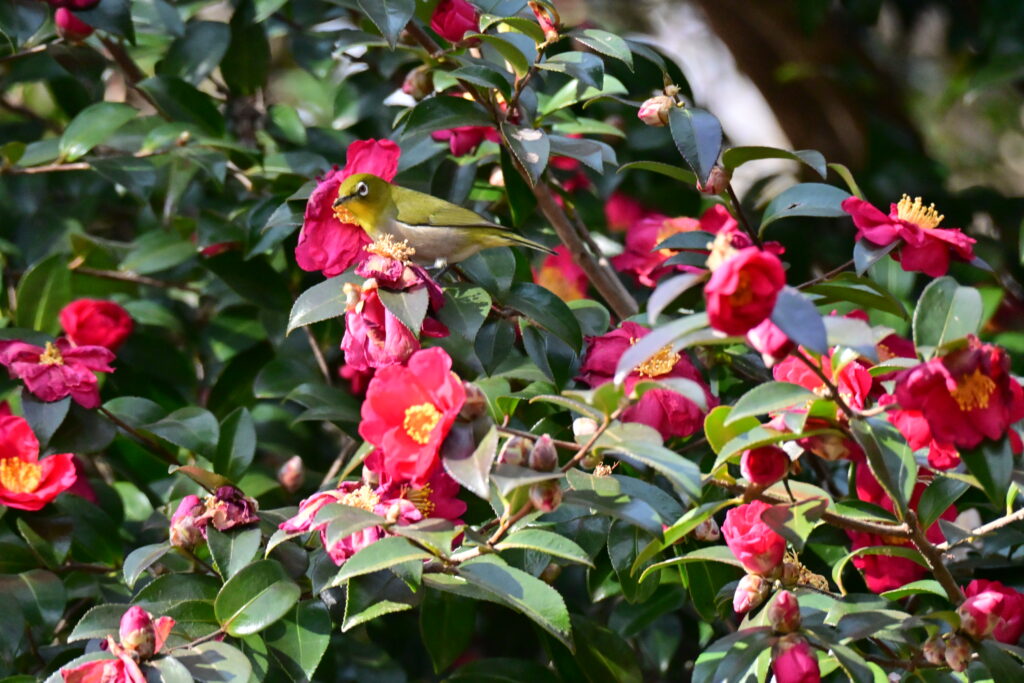 梅の花に集まるメジロを撮ろうと公園内の大きな梅の木を訪れましたが未だ咲き始めでメジロは集まってきませんが今満開を迎えた山茶花の花にメジロとヒヨドリが蜜を争っていました。