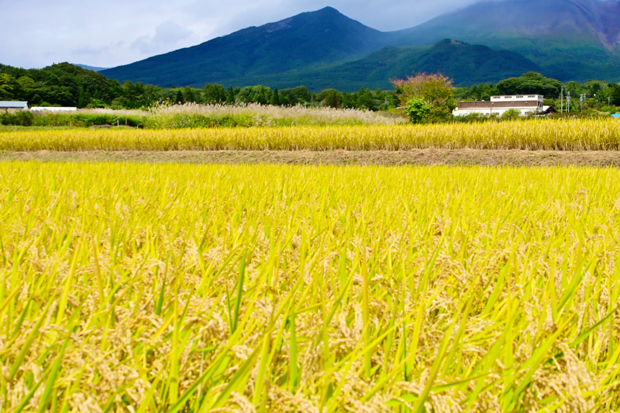 黄金色の棚田の奥に桜の木が色づいて居ます。